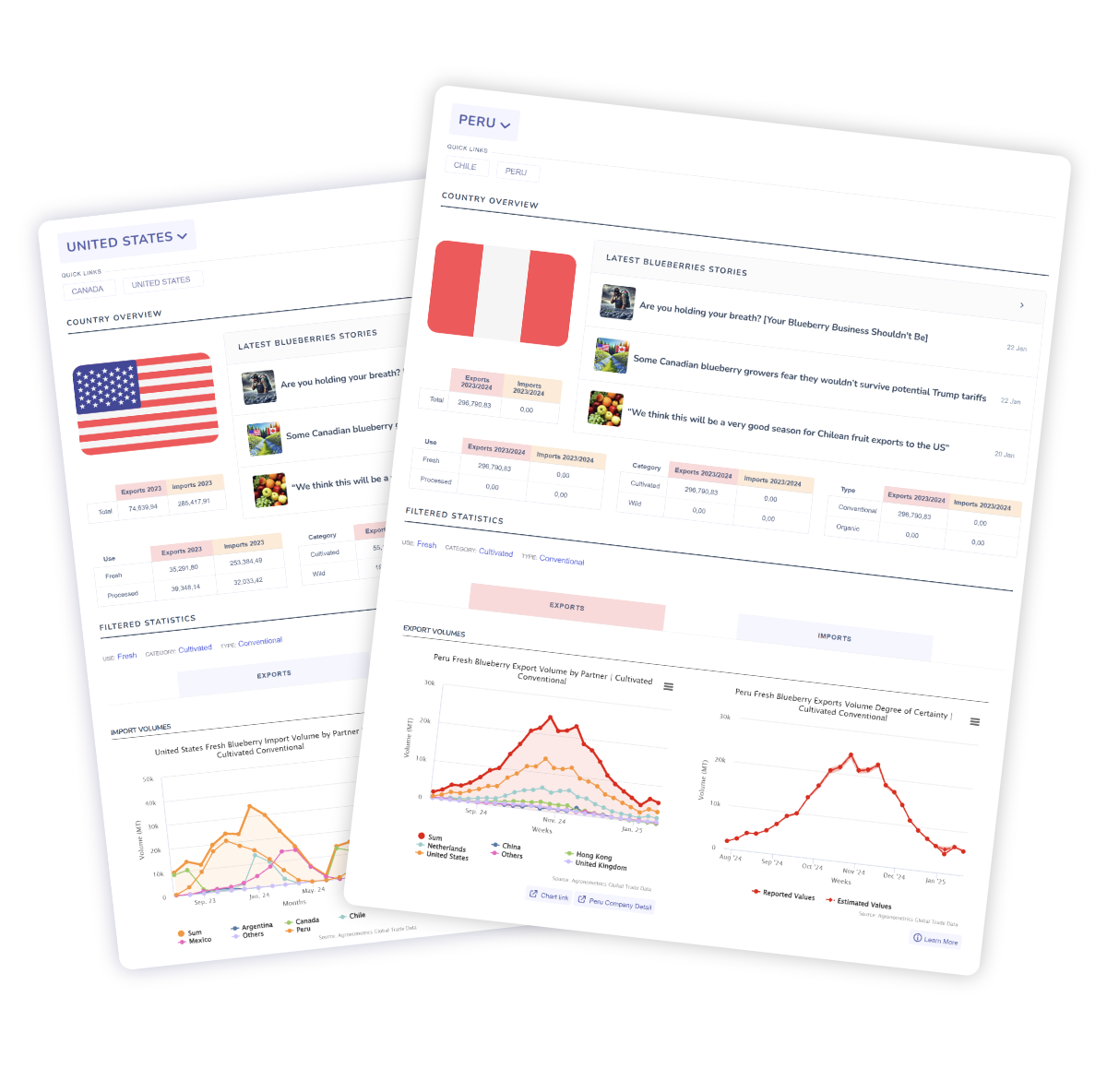 Blueberry trading is multidimensional as is the data that describes it. Not only can you separate the origin and destination of all trading we track, you will also be able to filter and aggregate the data through the following variables: